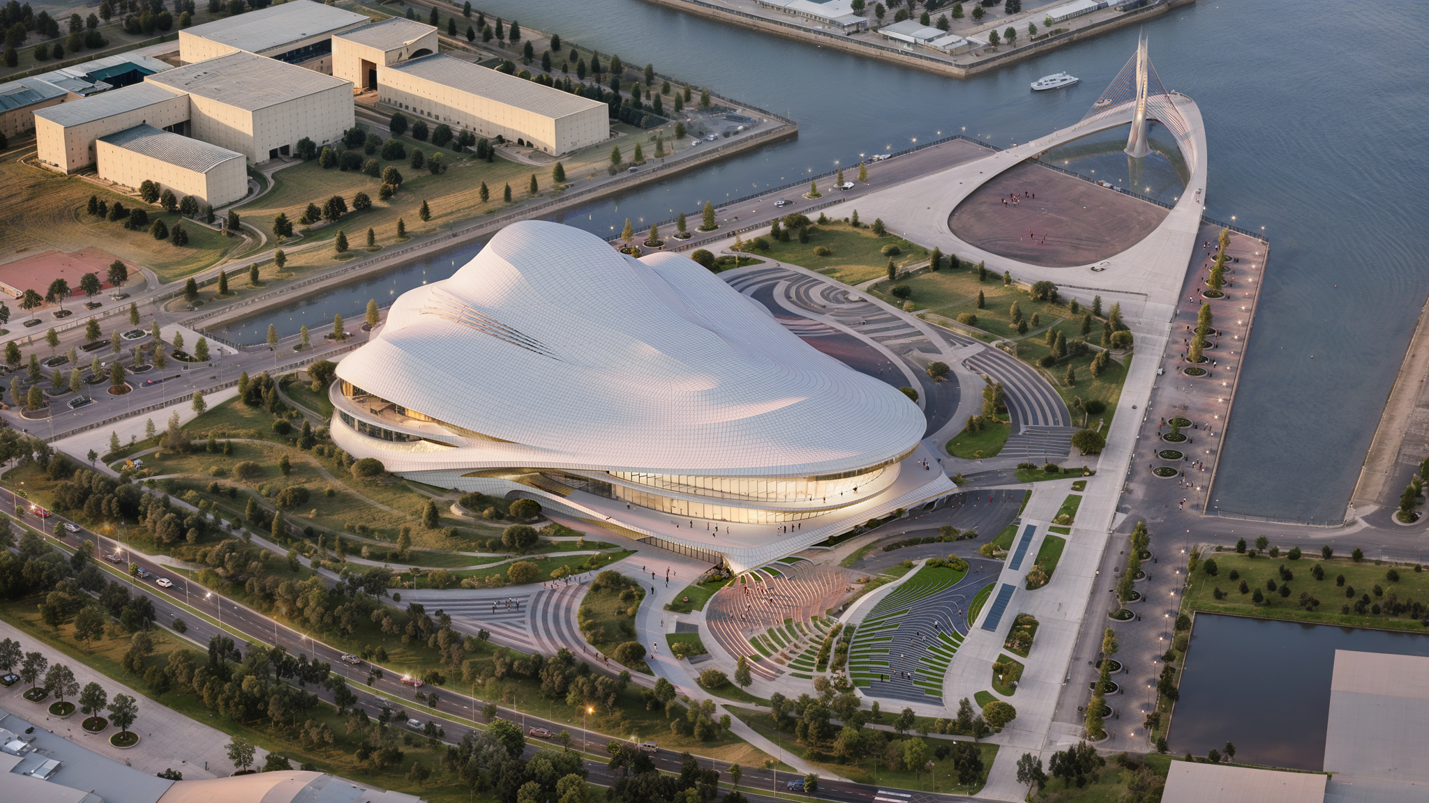 Concert hall in Tyumen. Bold design of a concert hall for a new part of the city in Tyumen. Surrounded by the Tur River with a modern concept of a pedestrian bridge.