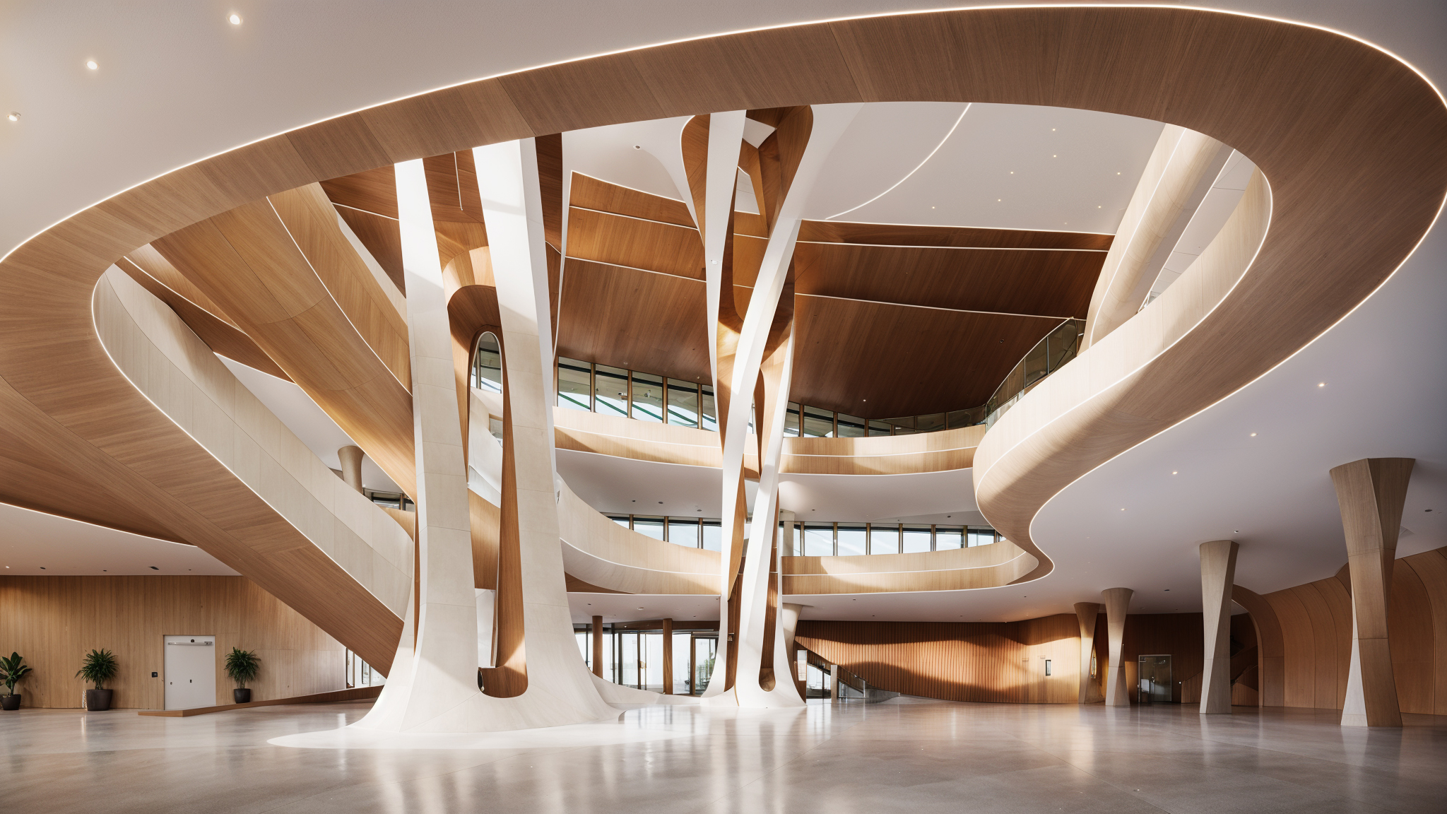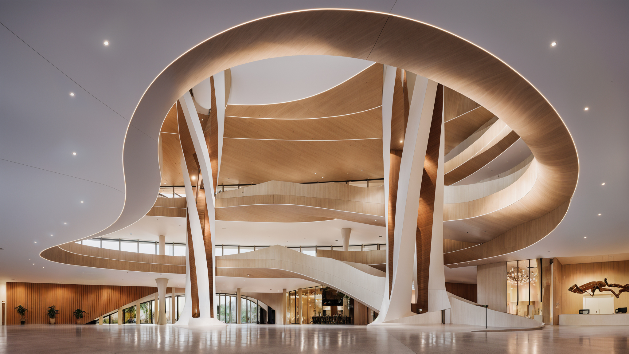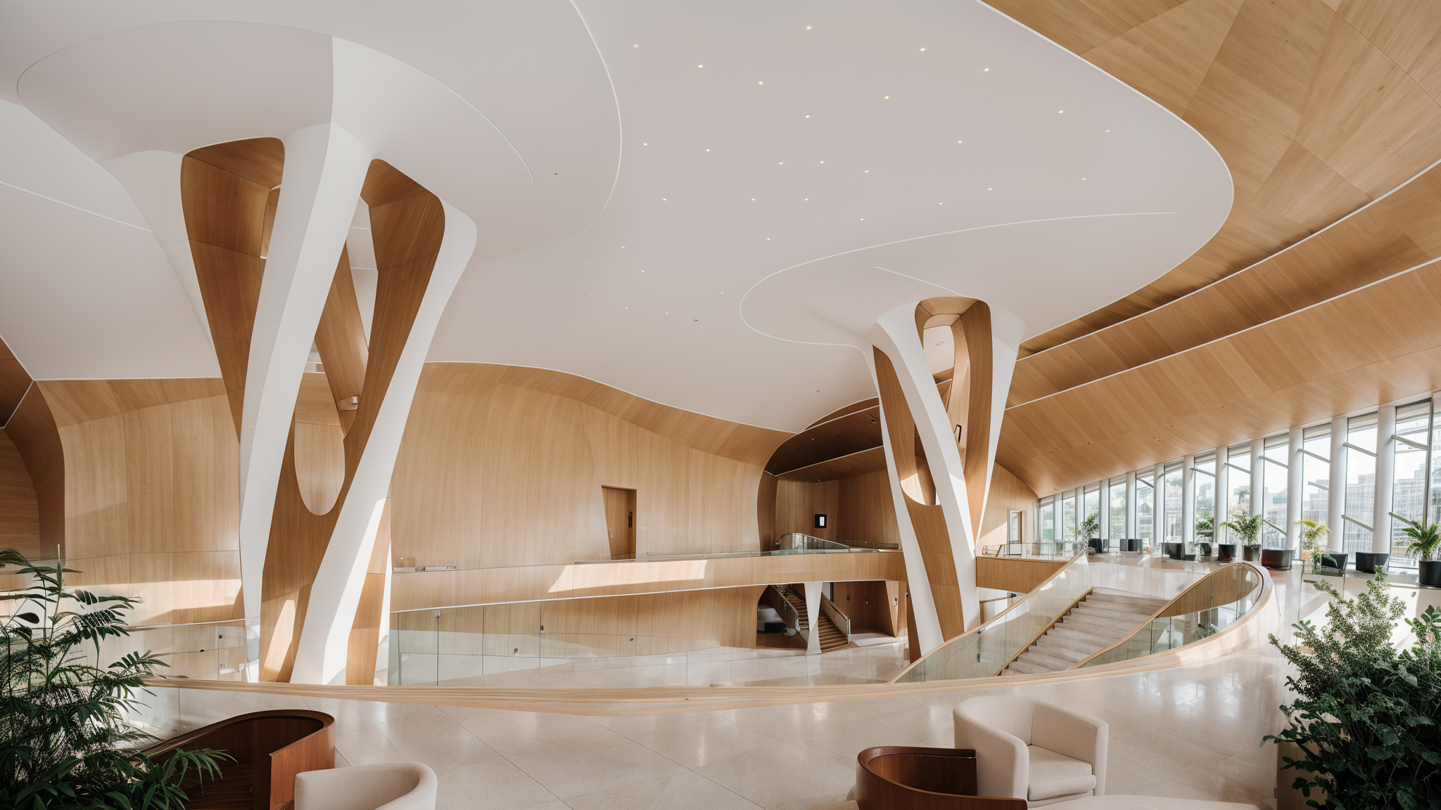 The newly designed concert hall in Tyumen, located alongside the Tura River, is celebrated for its innovative and fluid architecture, reminiscent of renowned architects Zaha Hadid and Santiago Calatrava. The building features a captivating interior, highlighted by a distinctive staircase and two dominant columns that enhance its aesthetic and structural integrity. Designed to host diverse performances, it serves as a cultural hub, merging modern architecture with the natural environment.